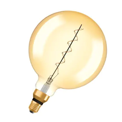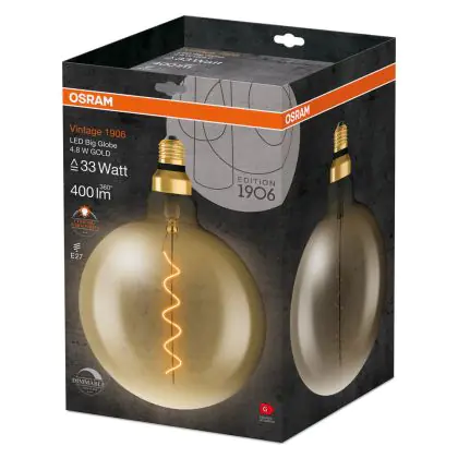 La Osram Vintage 1906 LED E27 Globe Filament Gold 200mm 4.8W 400lm - 822 Extra Warm White | Dimmable è la perfetta sostituzione per la tua lampada convenzionale 33W con attacco E27 grazie alla sua tecnologia LED. Passare a LED ti offrirà tanti vantaggi!