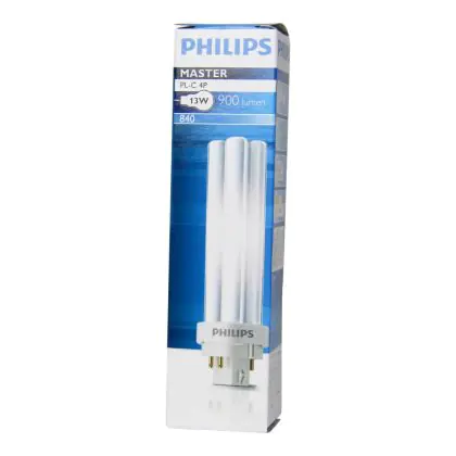 Philips PL-C 13W 840 4P è una lampada fluorescente compatta a basso contenuto di mercurio efficiente con attacco a 4 pin G24q-1. Questa lampada firmata Philips assicura prestazioni luminose fino a 10.000 ore che equivalgono a 3 anni con un utilizzo giornaliero di 8 ore.