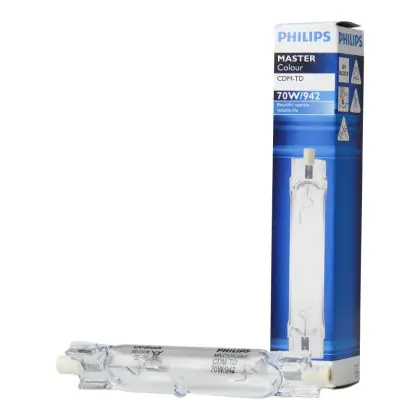 CDM-TD sono lampade a scarica compatte a doppio attacco. La luce emessa é molto brillante, e la qualità di illuminazione rimane stabile nel tempo grazie all'inserto ceramico. Le lampadine Philips CDM-TD 70W 942 RX7s (MASTERColour) presentano, in particolare, le seguenti caratteristiche: